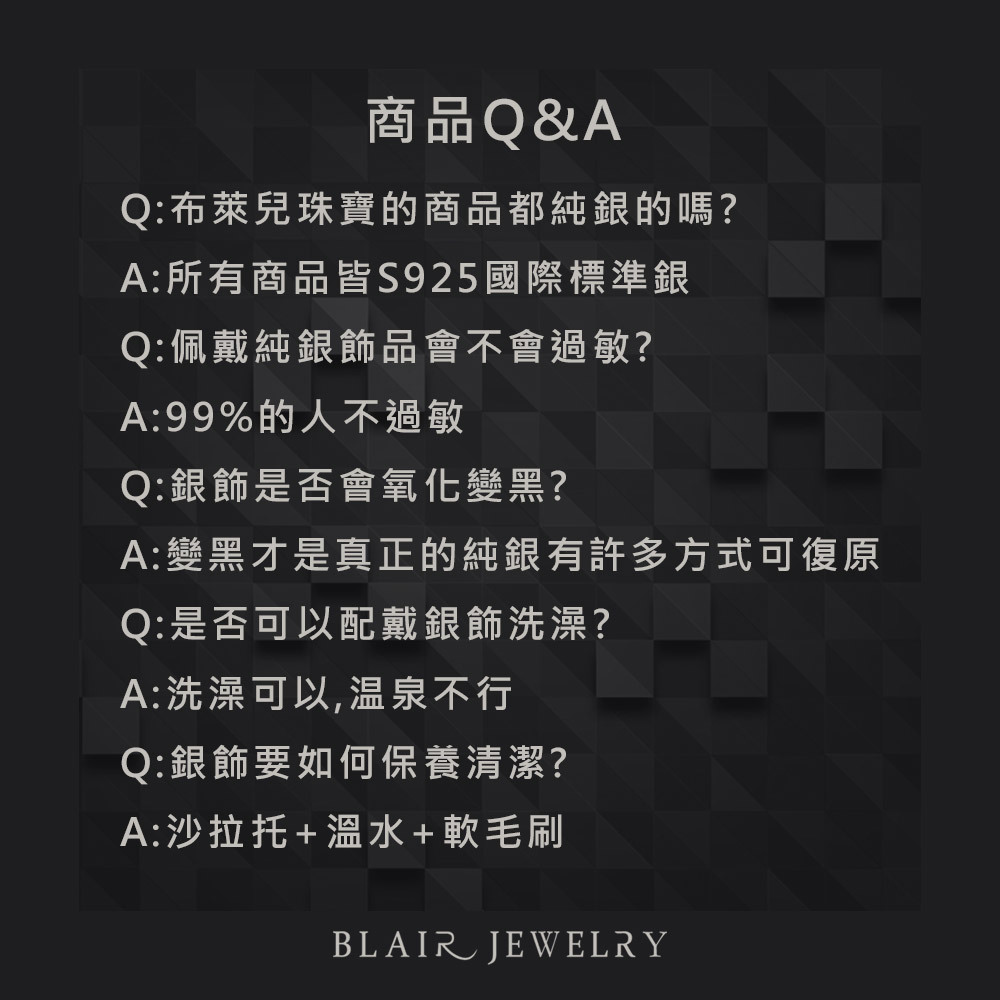 A:布萊兒的銀飾皆為國際標準925以上純銀,並不定時透過臺灣銀樓公會同款專業驗金儀器檢測